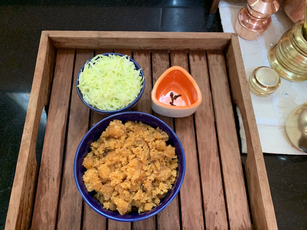 - एक वाटी कैरी कीसाला दोन वाट्या भरून गूळ बारीक करून घेणे. जर कैरी गोडसर नसेल तर अडीच वाटी गूळ घ्या.