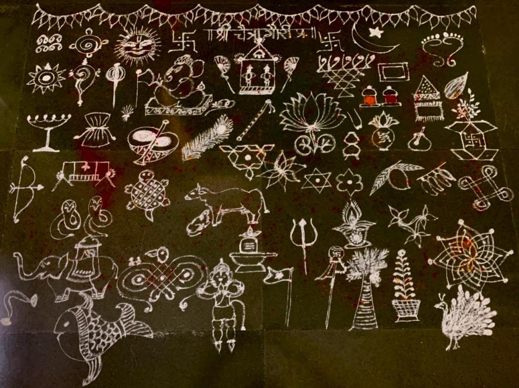 The motifs of the Chaitrangan Rangoli are those which indicate elements of nature and signs and symbols of Hinduism. It is gratitude towards nature and bhakti towards the Giver, that forms the basis of Chaitrangan.