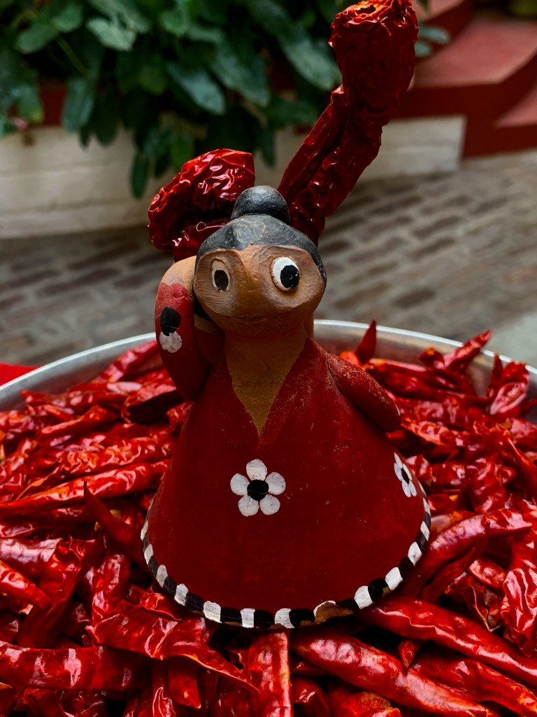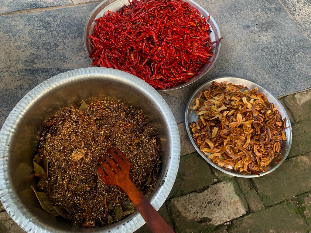 - मिरची: दोन प्रकारची. ब्याडगी व गुंटूर मिरची. उन्हात चार दिवस ठेवून चांगली वाळवलेली व त्याचे देठ काढलेली